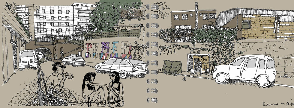 Passeio-me por alguns dos lugares de possibilidades e vivências alternativas da cidade, que aos poucos se transformam e acabam por dar lugar ao turismo e à especulação imobiliária. Nestes desenhos surgem pessoas, que me pediram para integrar o lugar que eu registava. Também elas foram passando a pertencer ao passado, começando a ser acompanhadas pelos indícios das transformações materiais e vivênciais daqueles que se foram afirmando e começando a delinear o futuro.